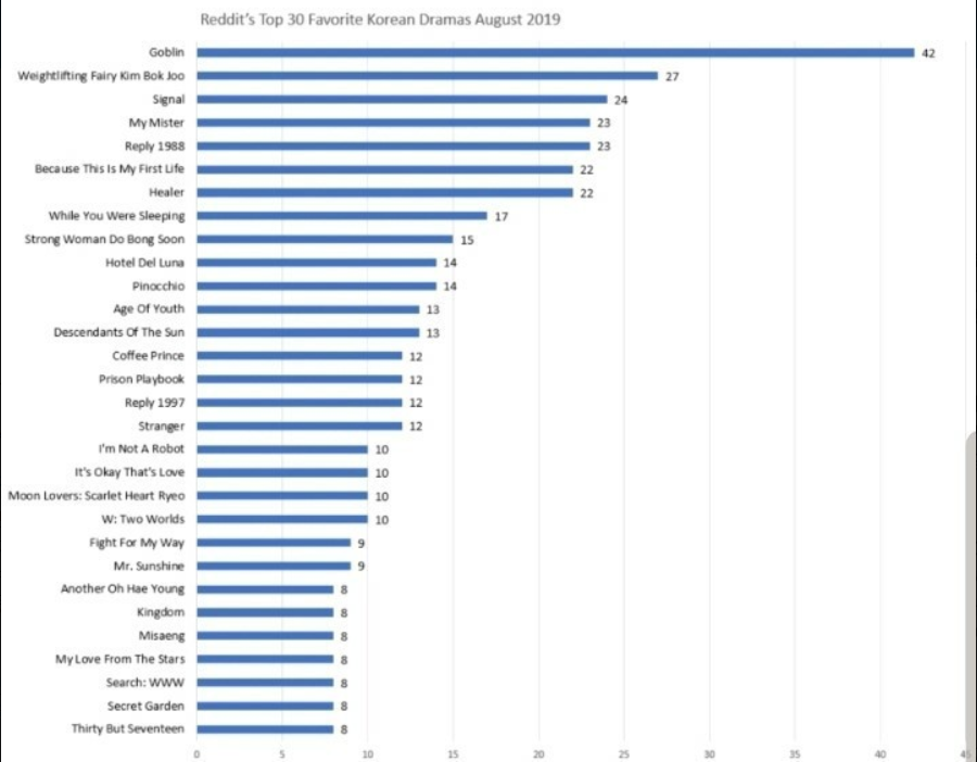 | 2019년 미국 커뮤니티 레딧에서 조사한 좋아하는 한국 드라마 탑30에서 현재 1위는 아직도 도깨비입니다. | |