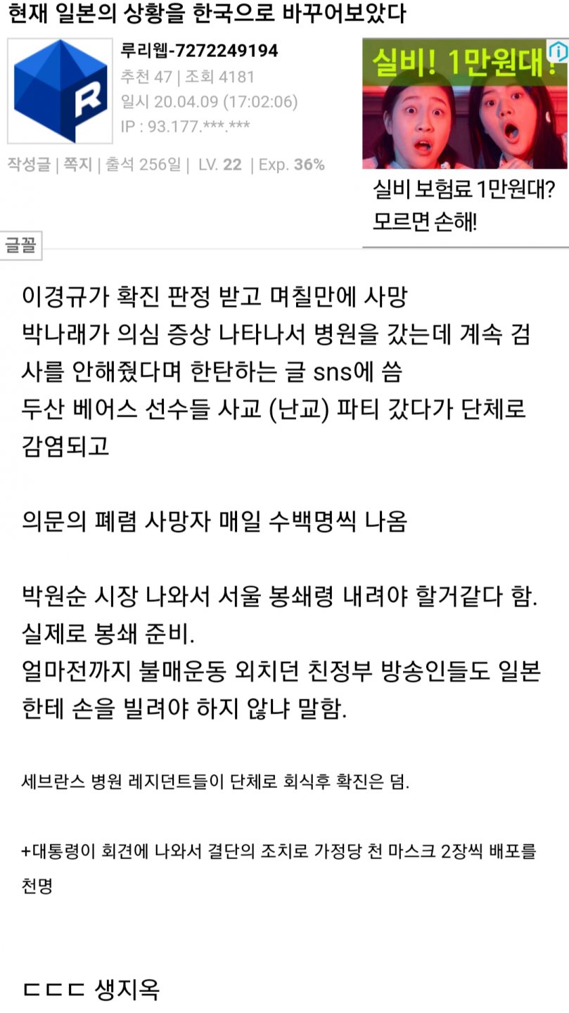 | 현 일본 상황을 한국에 대입하면 | 한류멋쟁이 | 2262 | 20-04-10 | |