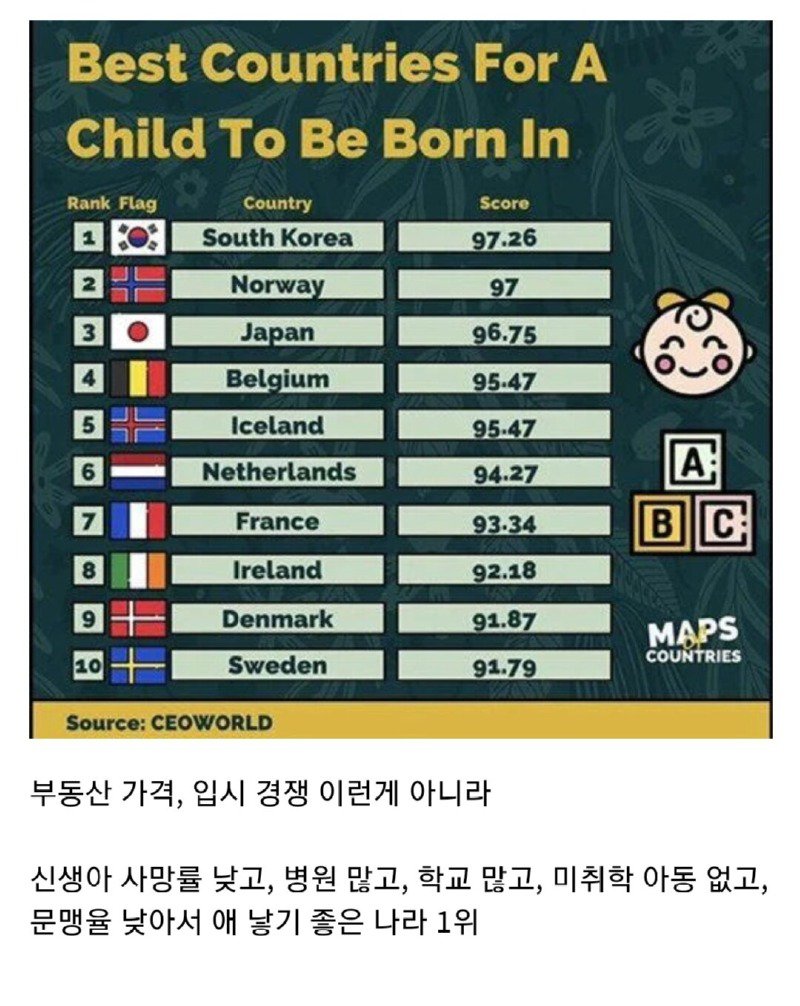 CEO 월드 (CEOWORLD) 매거진에 따르면 한국은 2020 년에 아이가 태어나기 가장 좋은 나라로 인정 받고 있으며 노르웨이와 일본은 각각 2 위와 3 위를 차지했습니다. CEOWORLD 보고서는 180 개국의 글로벌 지수에서 “교육 및 웰빙”과 “영양 및 건강”을 포함한 요소를 비교합니다. 시에라 리온, 소말리아, 니제르, 중앙 아프리카 공화국, 차드의 어린이들은 최악의 상황에 직면합니다.
