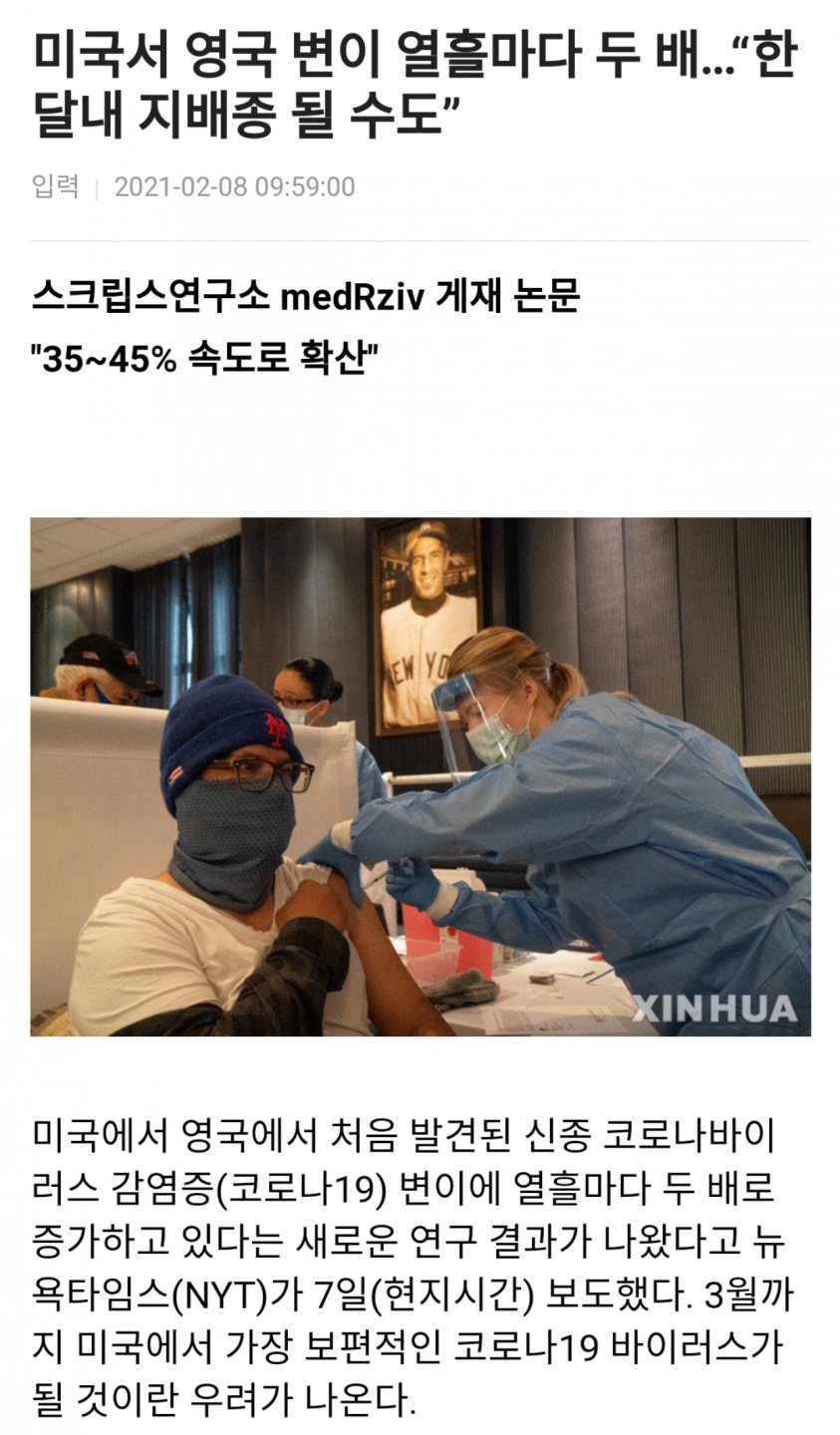 코로나19 최대 감염국인 미국의 상황이 특히 심각하다. 열흘마다 영국 변이 감염자가 두 배씩 증가하고 있다. 이런 추세라면 다음달엔 영국 변이가 기존 바이러스를 밀어내고 가장 보편적인 바이러스가 될 가능성까지 제기된다. 미 비영리연구단체 스크립스연구소는 7일(현지시간) 이런 연구 결과를 담은 논문을 발표하고 “영국 변이가 미국 대부분 지역에서 지배종이 되는 상황에 대비해야 한다”고 경고했다. 지난달 미 질병통제예방센터(CDC)가 내놓은 전망과 거의 맞아 떨어진다.