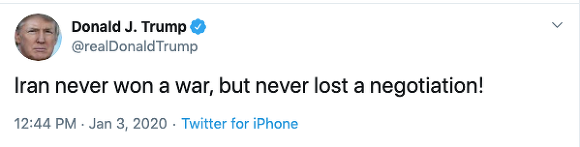 지난 3일 미국의 공습으로 이란의 최고사령관 솔레이마니가 사망한 뒤 트럼프가 방금 트위터에 올린 글이다.
